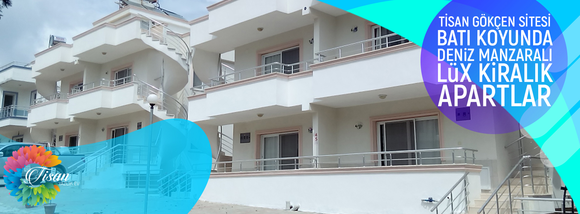 Tisan-Gökçen Sitesi Batı koyunda butik, denize 50 m mesafede (Denize en yakın konumlanmış apart dairelerdir.) 2+1, mobilyalı, klimalı, bakımlı, temiz, sahibinden kiralık katta daireler.